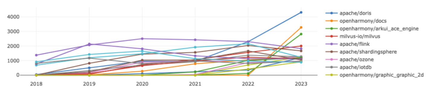 排名前三的分别是OpenHarmony、openEuler和Anolis,代表了操作系统绝对的地位,特别是OpenHarmony,发展最为迅速;