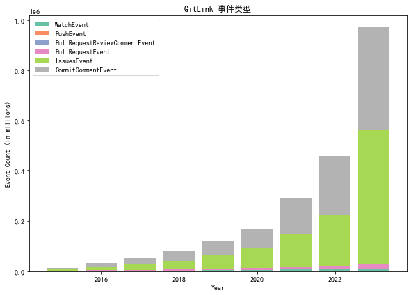 对于GitLink平台,同样选择了前3万个活跃仓库作为基准。鉴于数据的局限性,仅选取了包括 CommitCommentEvent、ForkEvent、IssueCommentEvent、IssuesEvent、PullRequestEvent 和 WatchEvent 六种事件类型的数据进行分析。