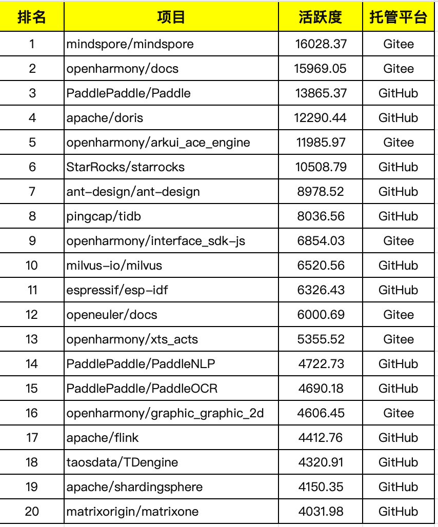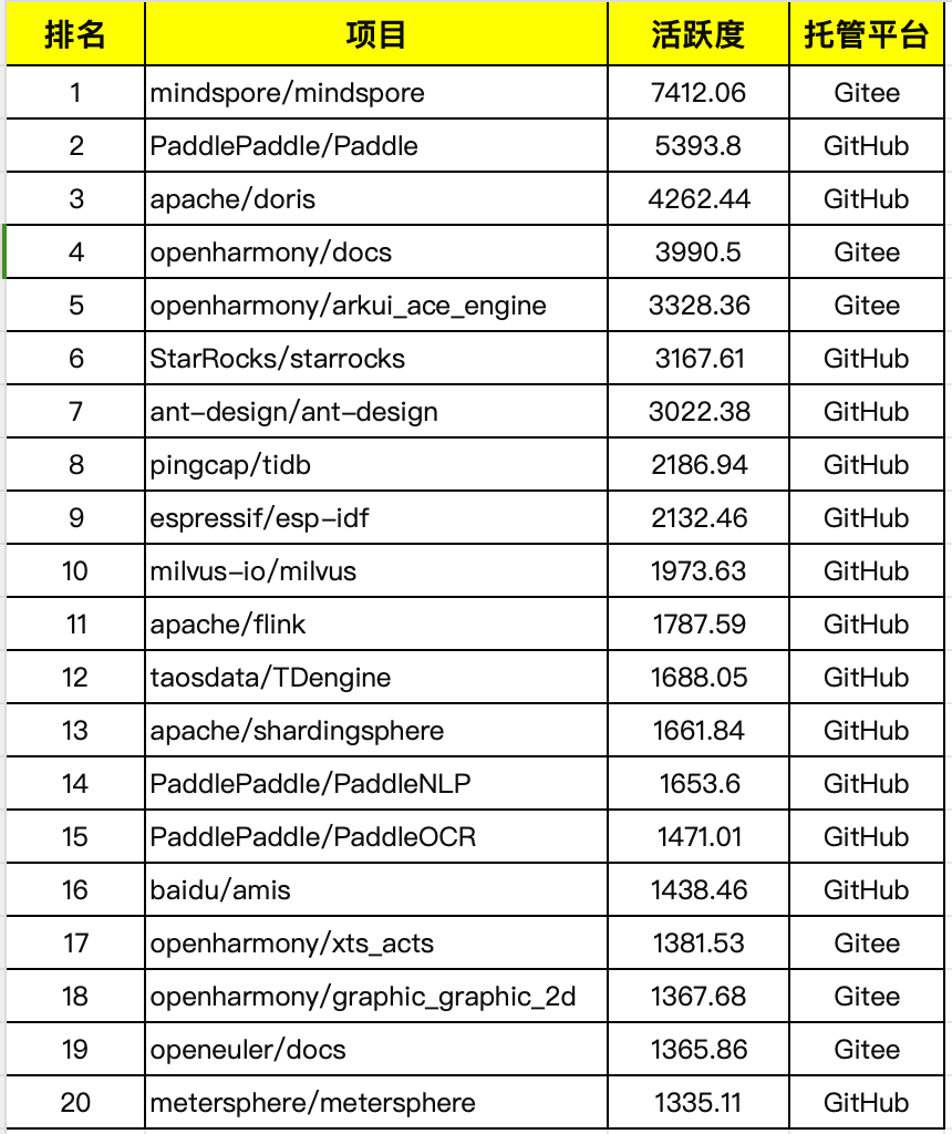OpenHarmony活跃度上升至第2,StarRocks 得益于其良好的开源生态以及全球的推广,在 021年上榜,并 在2023年直接上升至第 6 位。
