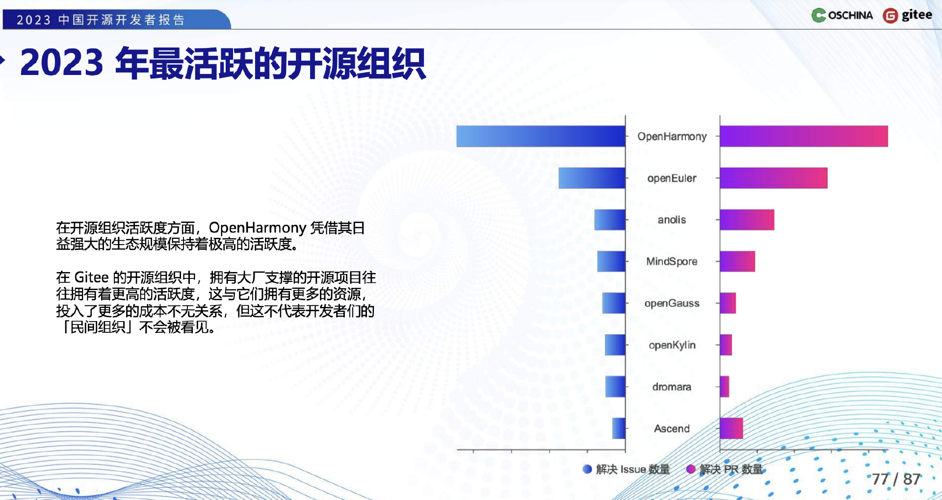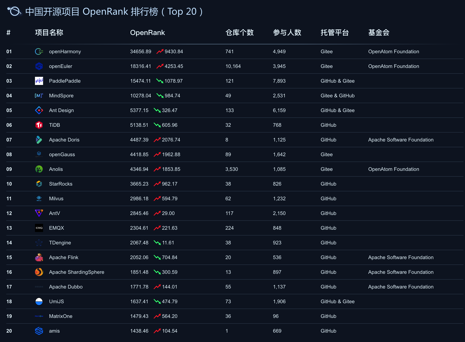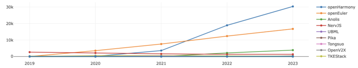 排名前三的分别是OpenHarmony、openEuler和Anolis,代表了操作系统绝对的地位,特别是OpenHarmony,发展最为迅速;