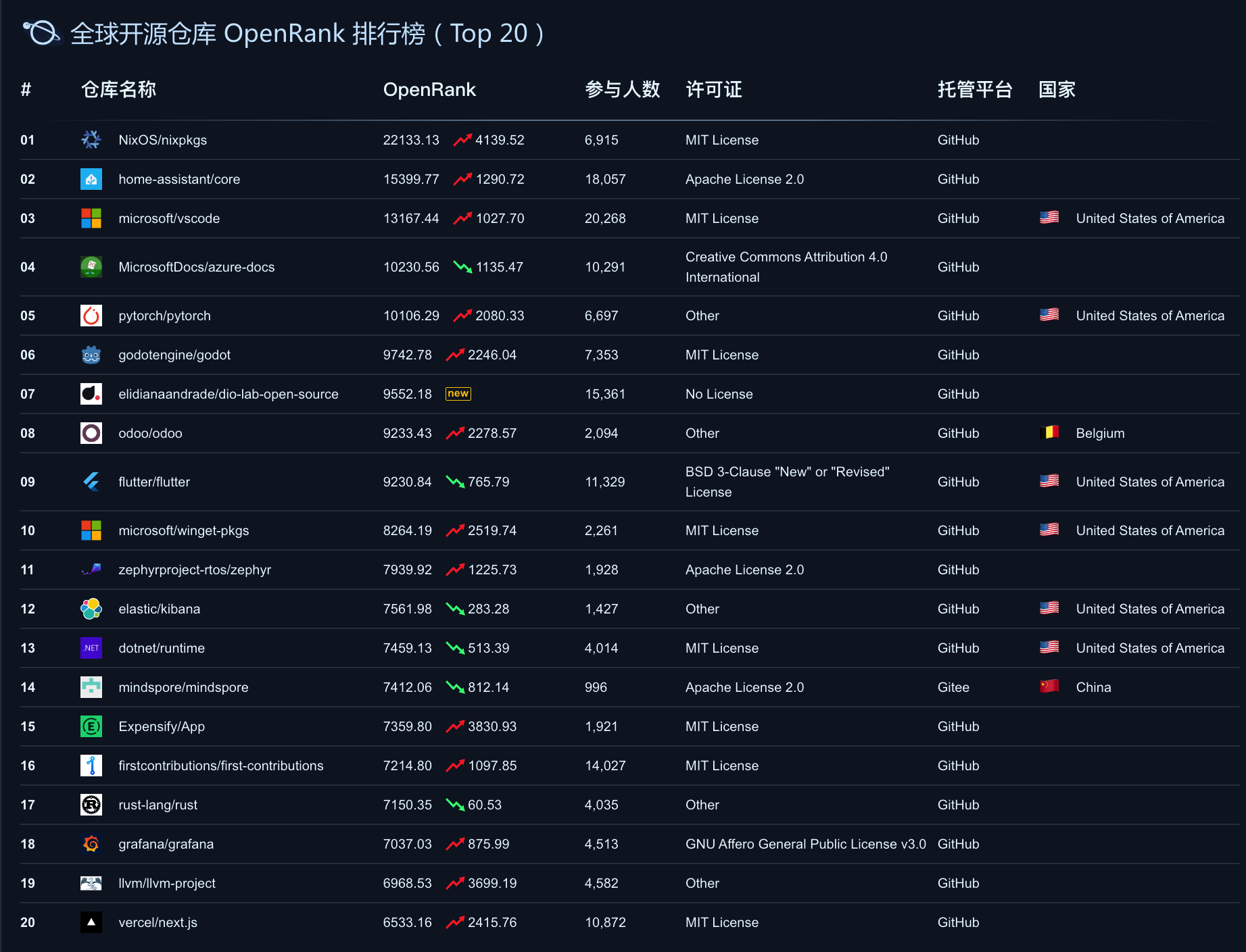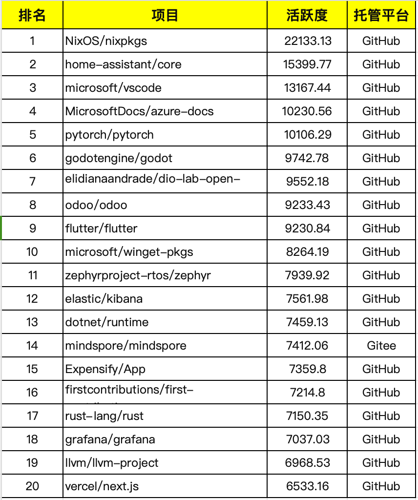 在开源项目洞察这部分,同样根据活跃度和影响力,分别比较了全球和中国排名前20的开源项目,可以看到: