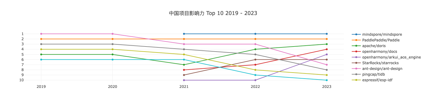 MindSpore稳居中国开源项目影响力第一,Paddle长期居于第二,OpenHarmony影响力上涨较快,Doris项目近3年排名上涨较快,反映出中国开源项目积极的发展。