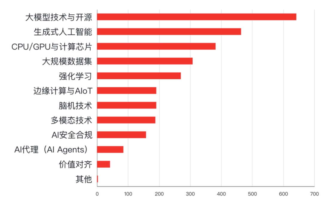 其一,大模型技术、开源、生成式AI、算力这些热词都是开发者最关注的技术突破方向。而更深远的问题,比如与隐私保护、日常生活息息相关的价值对齐、安全合规等问题,受关注度弱于其他技术突破方向。这可能是因为很多人还未对「人工智能的潜在伦理风险」产生实感,这些情节暂时还存在于电影之中。