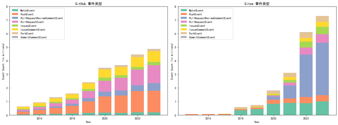 由于GitHub平台活跃事件的庞大,接下来的分析工作,建立在每个平台的前3万个活跃仓库的基准之上。为了方便比较,选取了GitHub与Gitee中与开源参与相关性较大的8类事件进行统计分析,包括CommitCommentEvent、ForkEvent、IssueCommentEvent、IssuesEvent、PullRequestEvent、PullRequestReviewCommentEvent、PushEvent 和 WatchEvent。