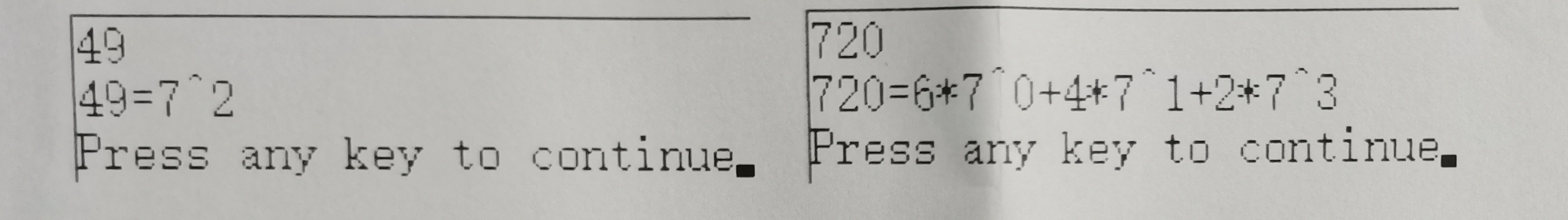 输入一个整数,将其按7进制位分解为各乘式的累加和(下图为输出结果)