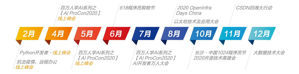 CSDN十余年来举办各类顶级技术峰会和中小型高端技术沙龙。每年举办的顶级技术大会包括:中国人工智能大会、中国大数据技术大会、中国软件开发者大会、区块链开发者大会等,技术会议领袖大咖云集,是每年度了解互联网技术趋势、探讨技术应用最新发展的权威会议。
