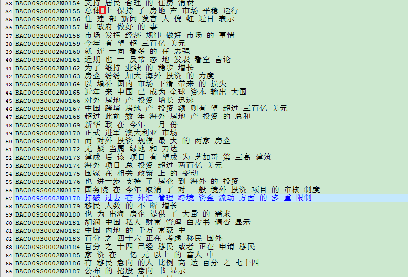 看到 AiShell的 transcript标注内容, 格式是下面这个样子, 引用其中若干条,也即看到各个字/词之间是有空格分割开来的(直接粘贴文本上来效果貌似不太明显), " BAC009S0002W0122 而 对 楼市 成交 抑制 作用 最 大 的 限 购 BAC009S0002W0123 也 成为 地方 政府 的 眼中 钉 BAC009S0002W0124 自 六月 底 呼和浩特 市 率先 宣布 取消 限 购 后 BAC009S0002W0125 各地 政府 便 纷纷 跟进 BAC009S0002W0126 仅 一 个 多 月 的 时间 里 BAC009S0002W0127 除了 北京 上海 广州 深圳 四 个 一 线 城市 和 三亚 之外 BAC009S0002W0128 四十六 个 限 购 城市 当中 BAC009S0002W0129 四十一 个 已 正式 取消 或 变相 放松 了 限 购 BAC009S0002W0130 财政 金融 政策 紧随 其后 而来 BAC009S0002W0131 显示 出 了 极 强 的 威力 "