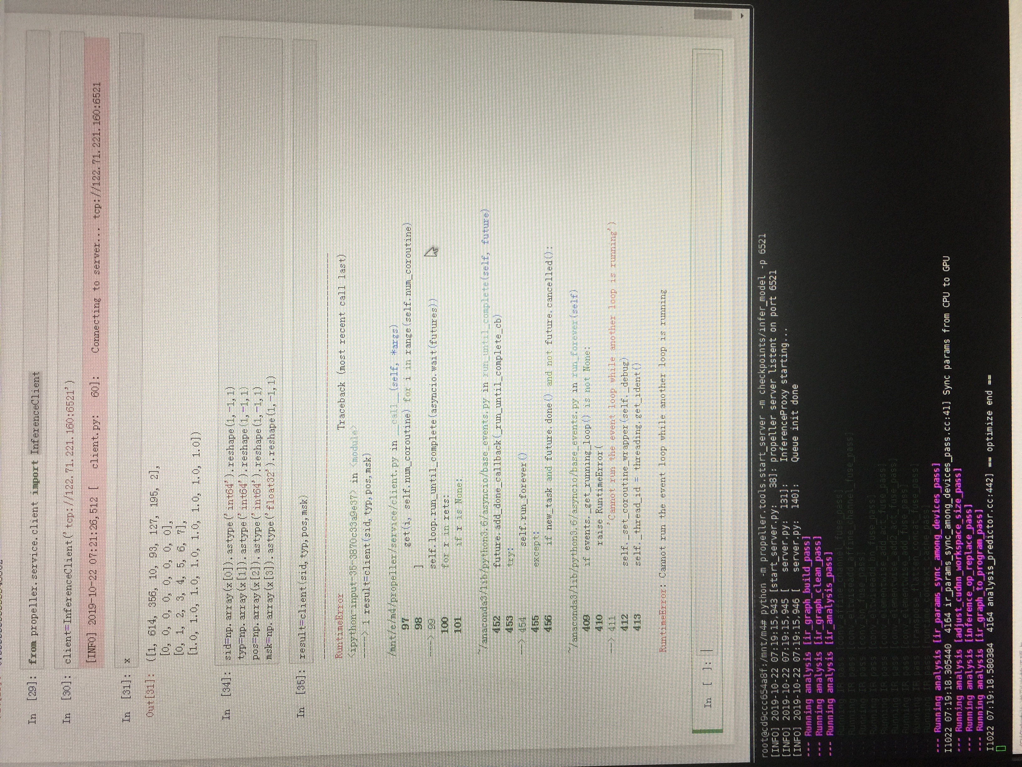 环境paddle-1.5.2.post97 cuda9 python3.6 存储模型是用的 save_inferrence_model(path,exe,[srd,type,pos,mask],[prob],train_program) 用目录下的prospeller起服务的后,推断时出现了如下错误,不知是何故: