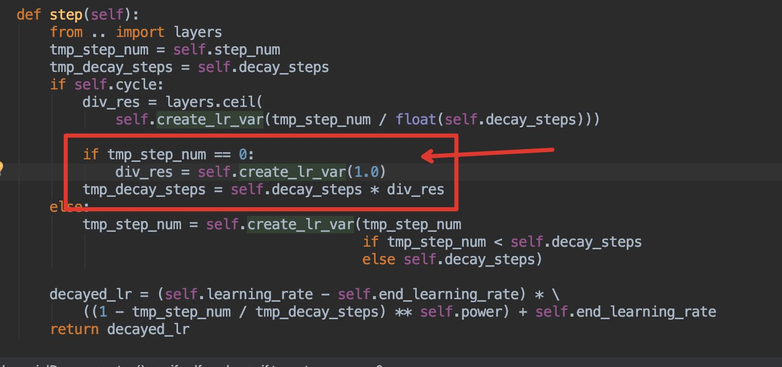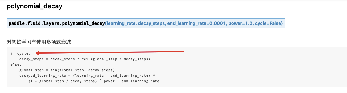 cycle是true的时候,只有衰减步数改动,没有学习率改动,这个描述是有问题的。 动态图API文件也有这个问题 按照源码描述,应该是else的算法也需要放在if里,同时这里会出现除数为0的情况,源码部分 在文档中并没有体现说明