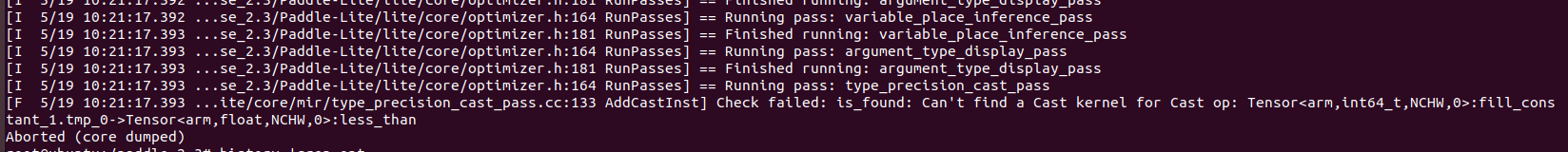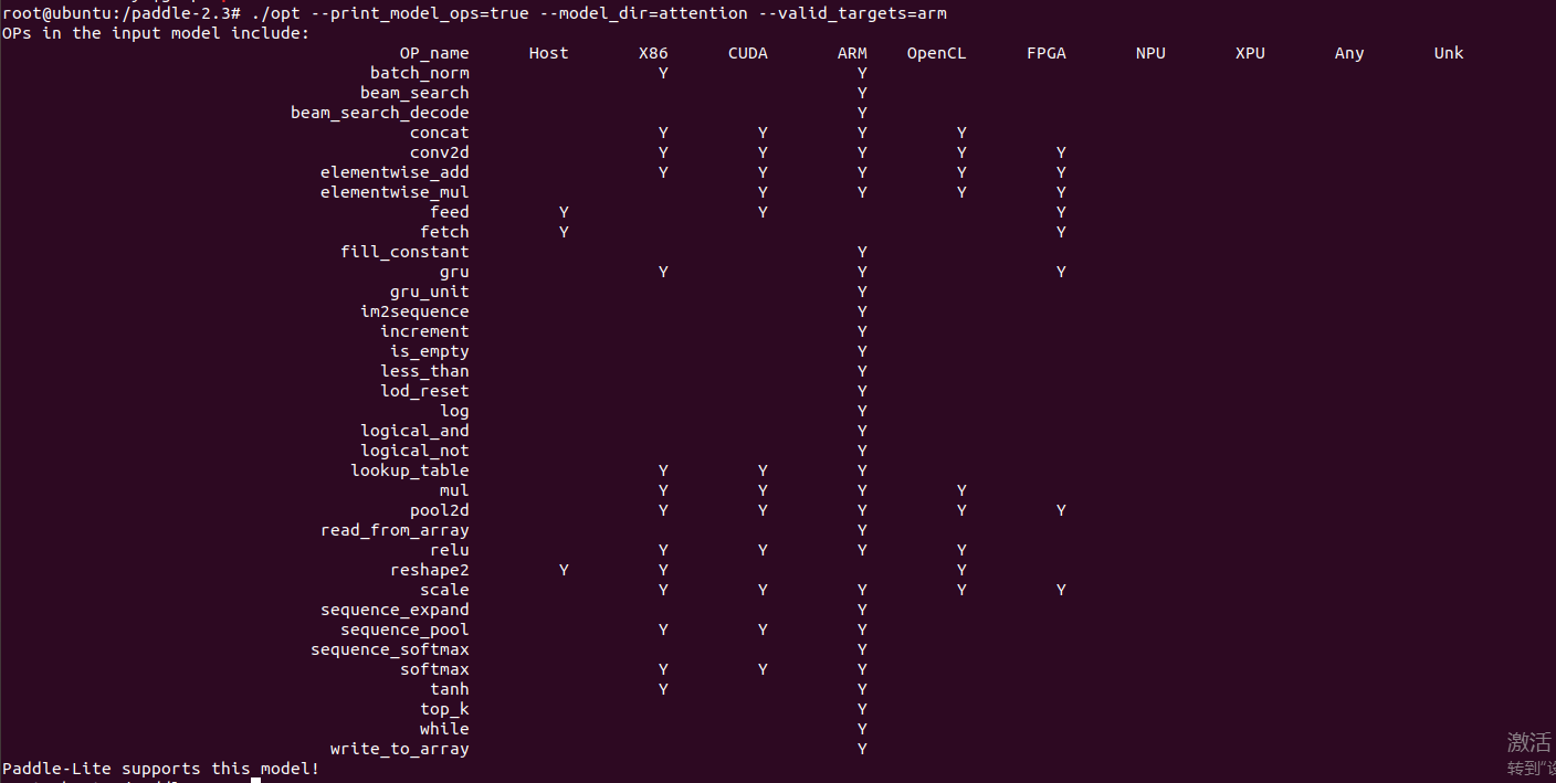 系统:ubuntu18.04 paddle-lite版本:v2.3 paddlepaddle版本:1.8 模型: infer_model.zip 问题描述: 使用如下命令测试paddle-lite是否支持模型: