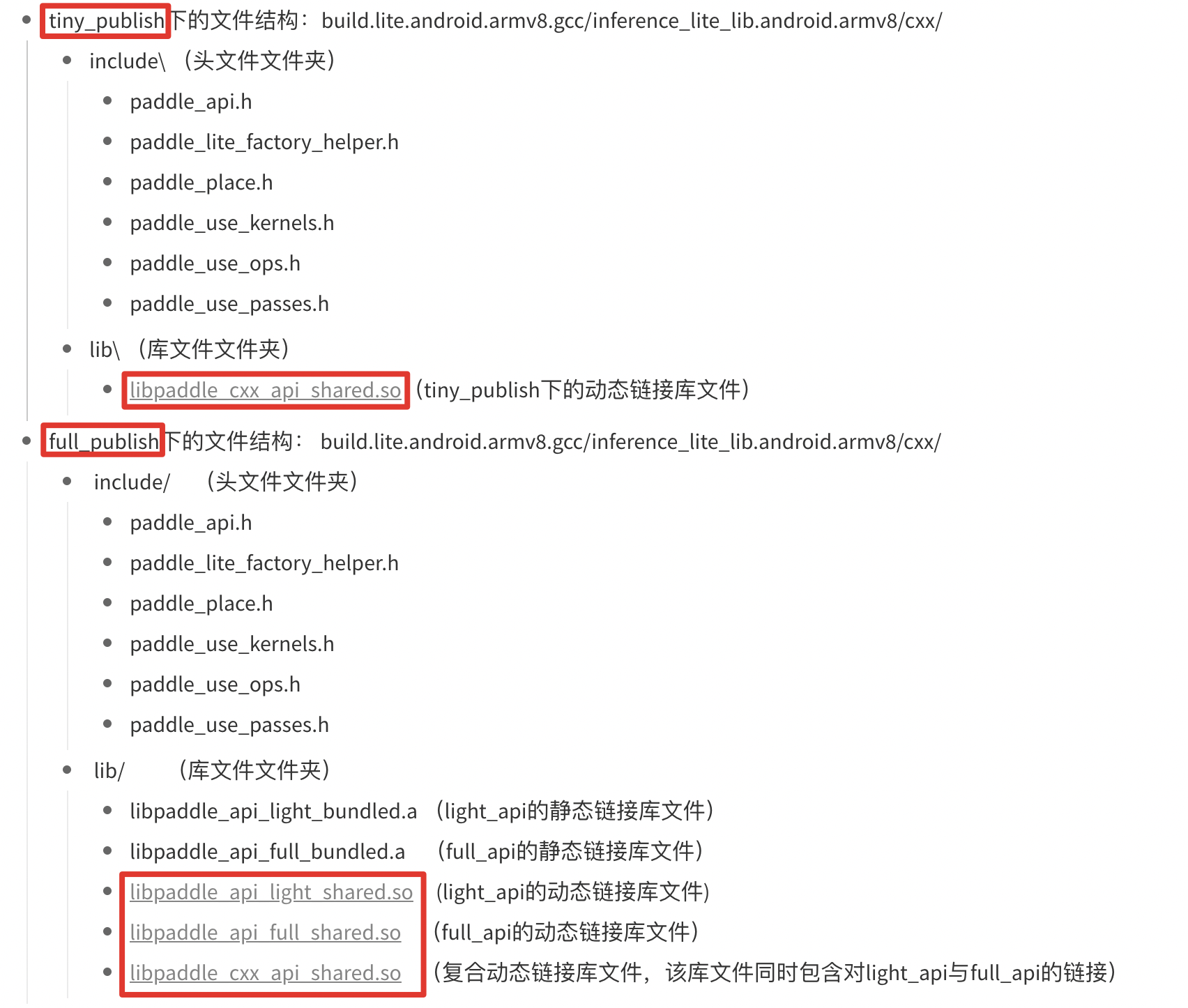 tiny_publish和full_publish编译结果的文件结构如下图所示(以armv8编译为例):