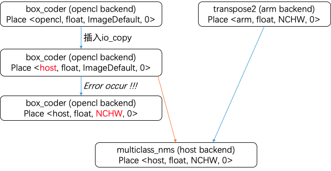 问题:模型转换报错,/lite/core/mir/type_layout_cast_pass.cc:169 AddLayoutInst] Check failed: is_found: Can't find a layout kernel for layout op: Tensor<host,float,ImageDefault,0>:box_coder_0.tmp_0/target_trans->Tensor<host,float,NCHW,0>:multiclass_nms 当输入 tensor 的 place 是<host, float, ImageDefault, 0>时,说明数据已经在 host 端,无需再进行 layout的转换(ImageDefault -> NCHW)。