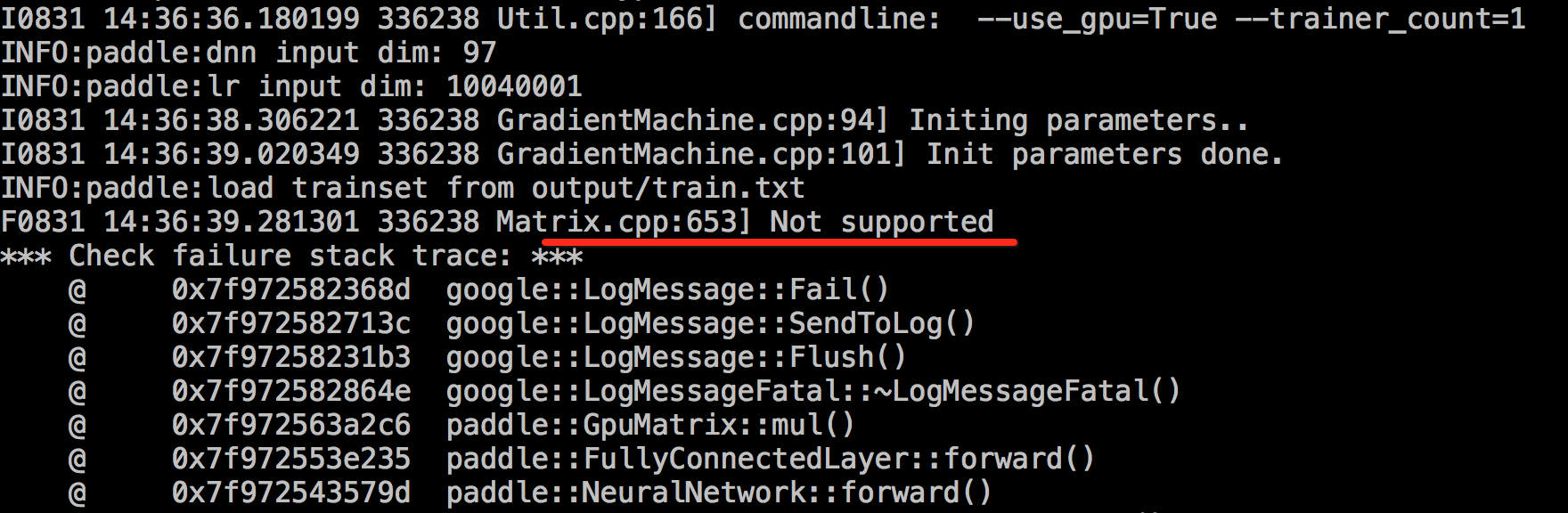 使用GPU训练CTR模型,发生错误:Matrix.cpp:653] Not supported。 使用CPU训练没有问题,CTR模型用CPU训练很慢,用GPU训练有没有解决办法?