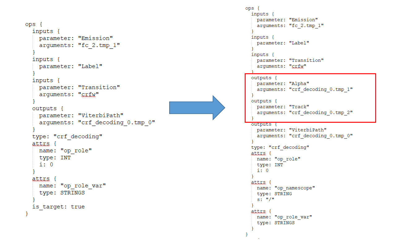 As Brian's patch to fix the multi-instances performance drop problem specially for rnn1 and chinese ner, it added two intermediate outputs for crf-decoding to decrease the memory allocate time. Therefore, it needs to modify the model as following figure: