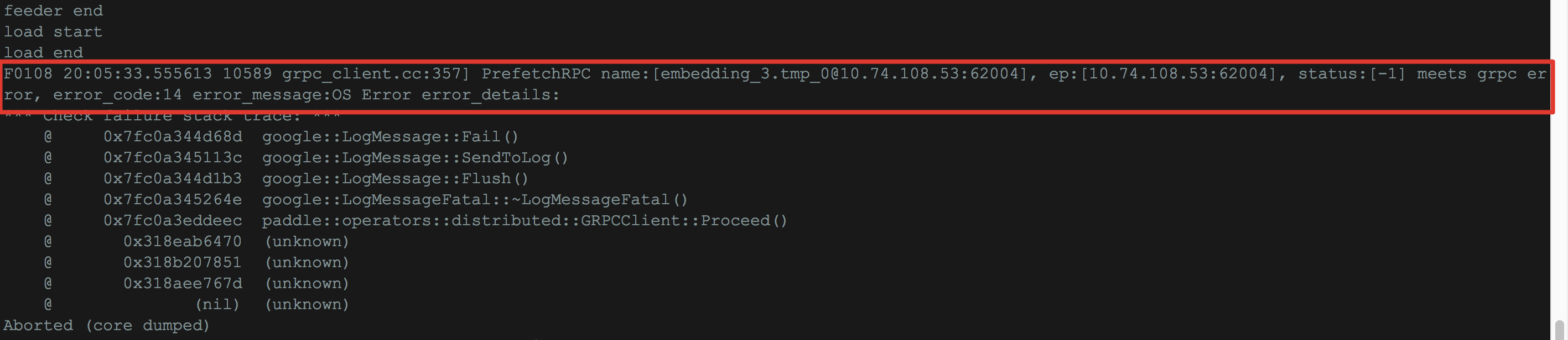Fluid 单机 infer时遇到报错PrefetchRPC Error