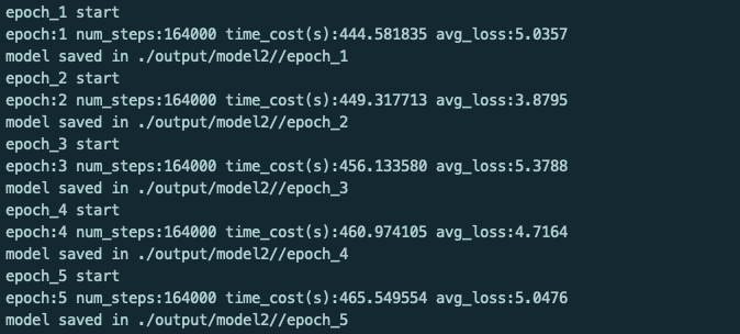print("epoch:%d num_steps:%d time_cost(s):%f avg_loss:%.4f" % (epoch_idx, i, total_time / epoch_idx, ret_avg_loss[0]))