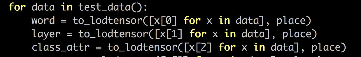 问题描述: 因为reader里面的word_idx, layer_idx都是N1维度的,但是class_idx是N10维的(可以认为N是batch_size),报错: class_attr = to_lodtensor([x[2] for x in data], place) File "/home/disk5/nlp/paddle/sequence_tagging_for_ner/utils_extend.py", line 24, in to_lodtensor flattened_data = flattened_data.reshape([len(flattened_data), 1]) ValueError: cannot reshape array of size 12400 into shape (620,1)
