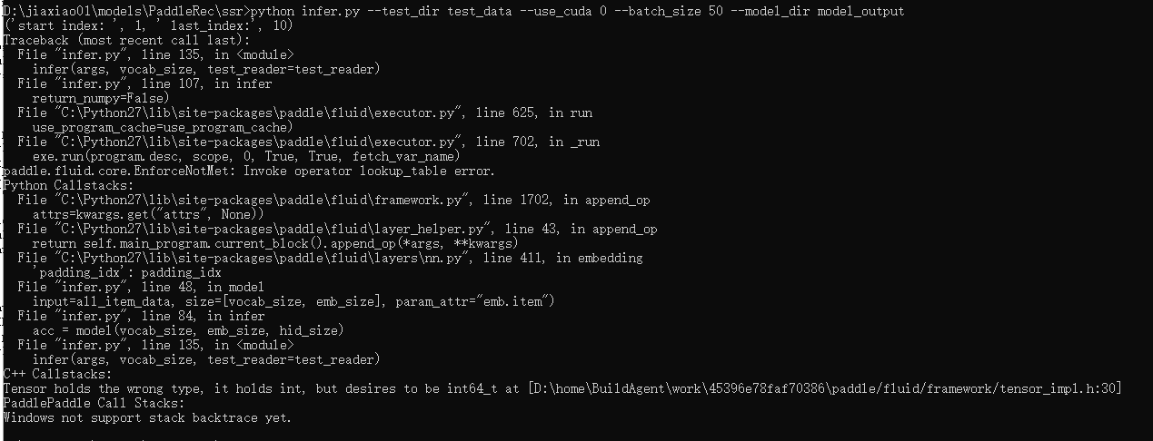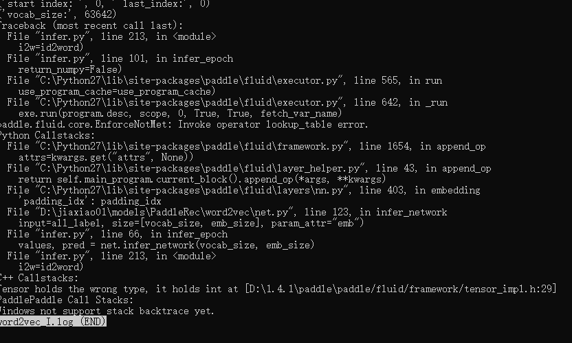 window下对训练好的word2vec模型进行预测,执行指令python infer.py --infer_epoch --test_dir data/test_mid_dir --dict_path data/test_build_dict_word_to_id_ --batch_size 20000 --model_dir v1_cpu5_b100_lr1dir/ --start_index 0 --last_index 0 对word2vec进行infer,报错信息如下: