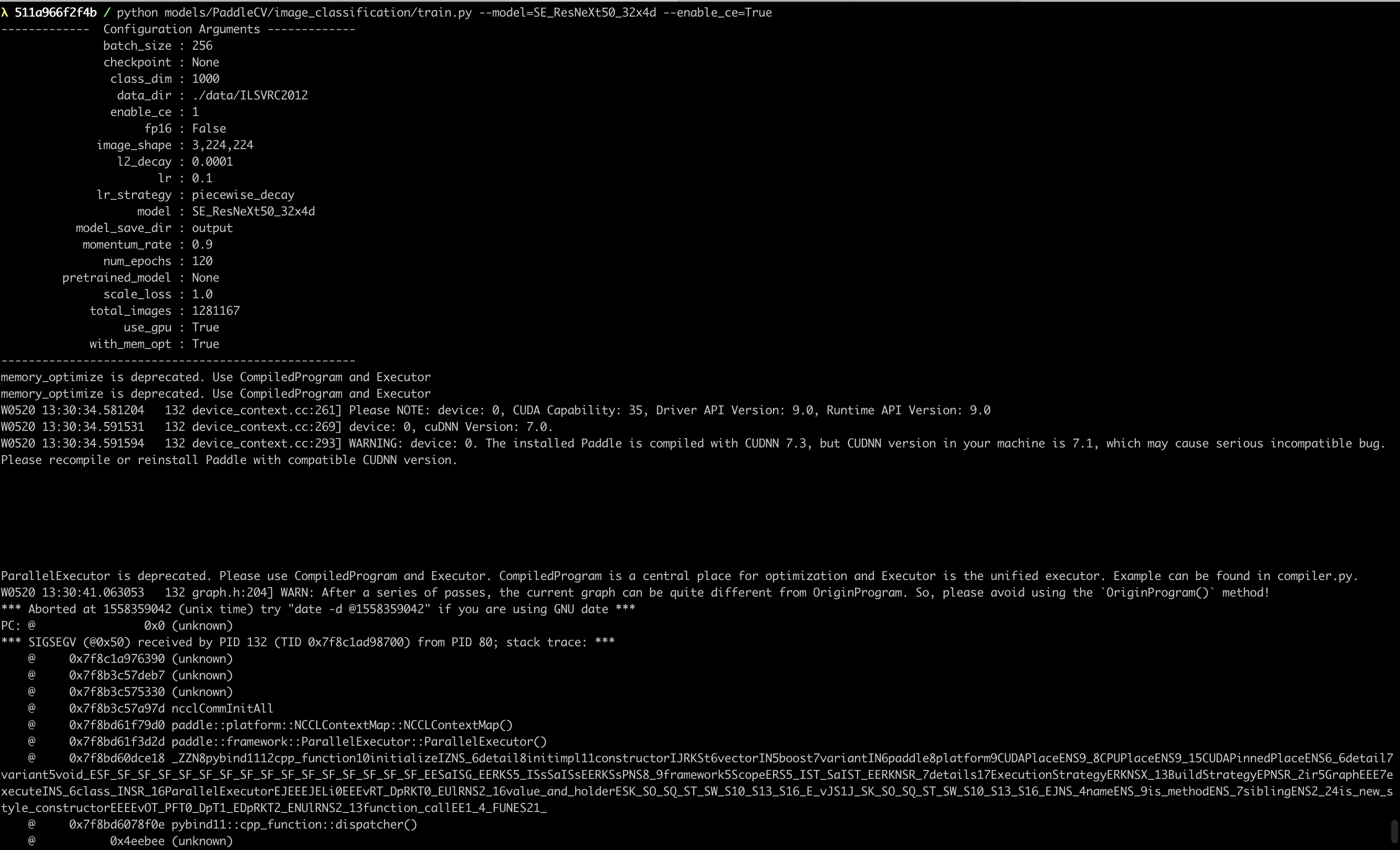 使用paddlepaddle/paddle:latest-dev和paddlepaddle/paddle:1.4.1-gpu-cuda9.0-cudnn7镜像,运行models/PaddleCV/image_classification/train.py --model=SE_ResNeXt50_32x4d --enable_ce=True,出现如下图问题: 退回1.3.0版本可以正常运行