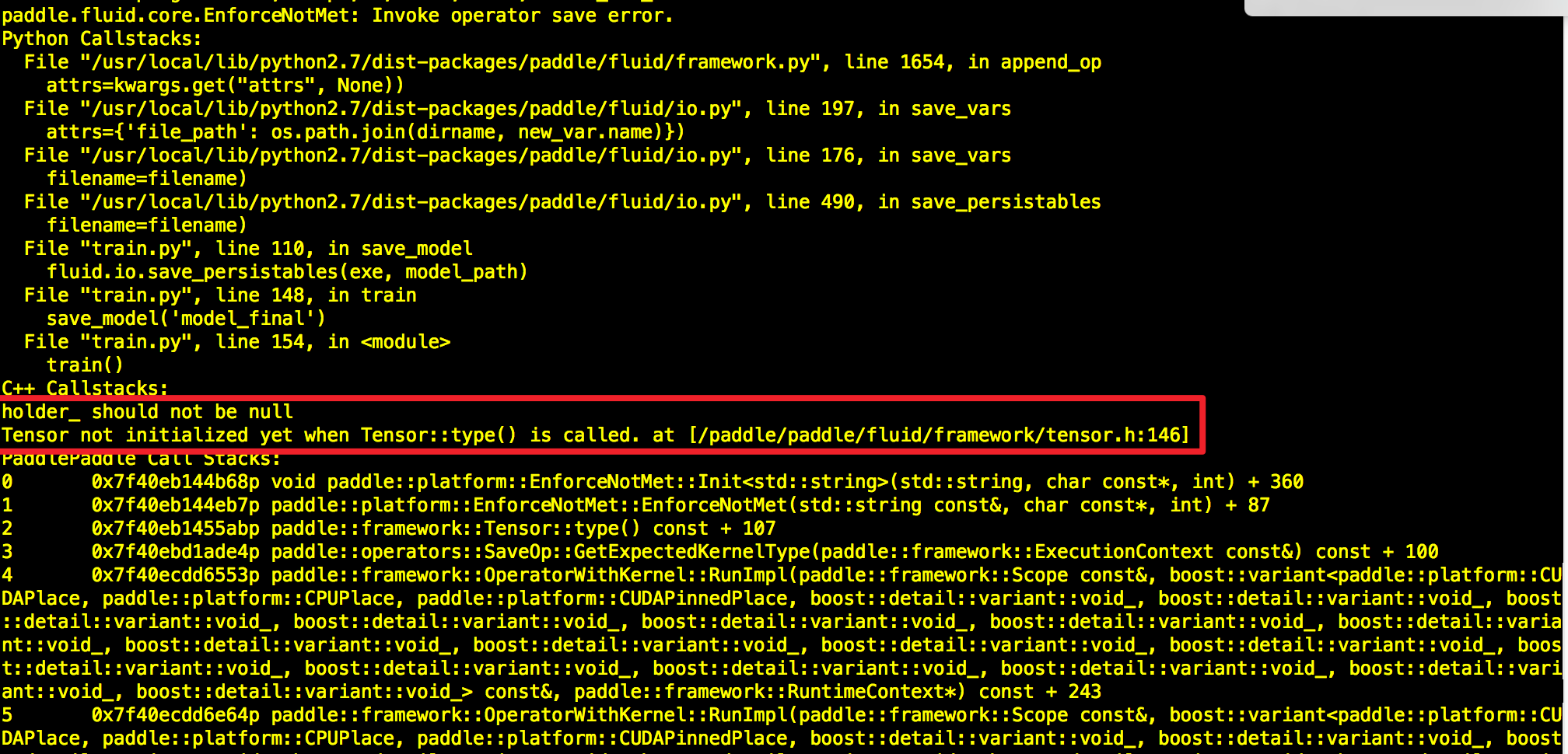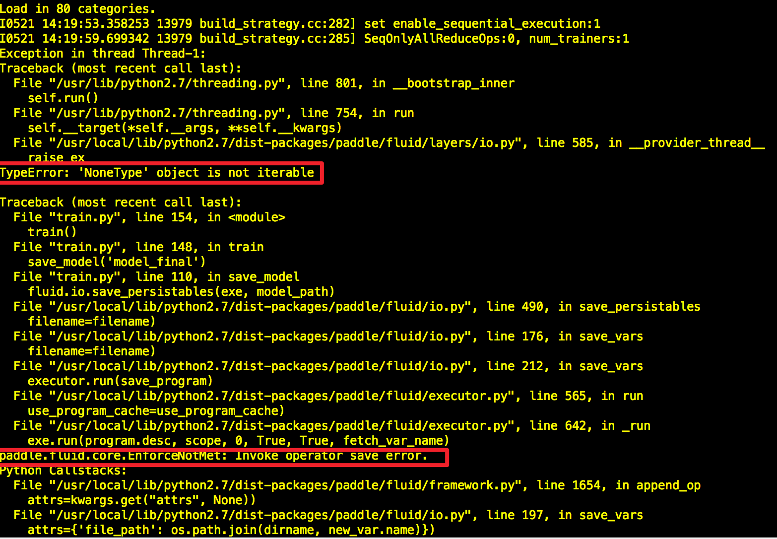 paddlepaddle:1.4.0 对于部署代码并数据及预训练模型之后,执行python train.py --model_save_dir=output/ --pretrain=weights/darknet53/ --data_dir=data/coco/coco17/ 出现报错