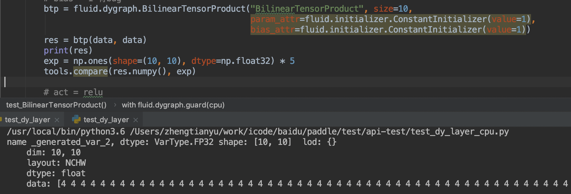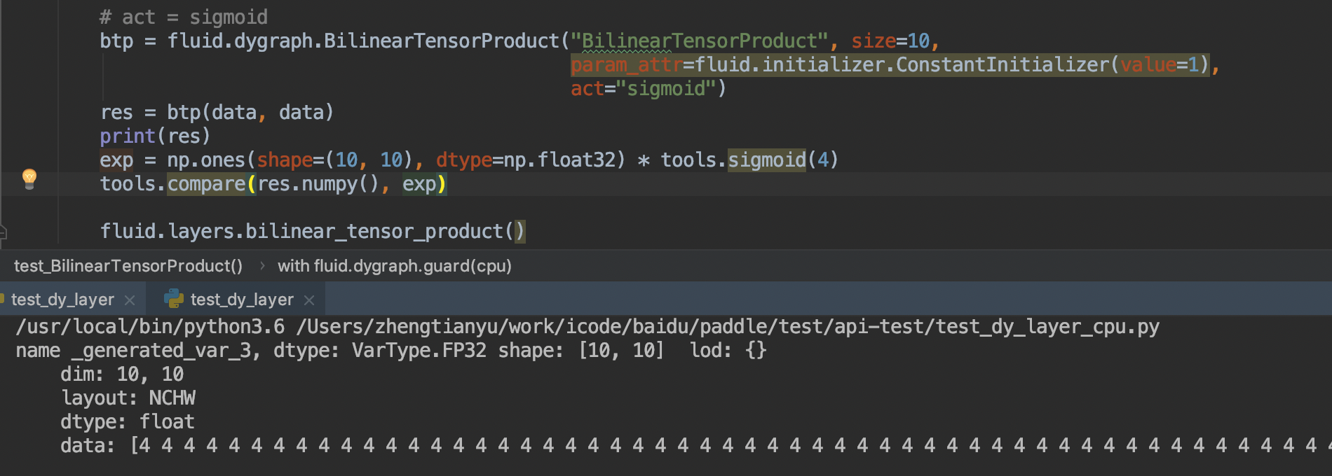 https://www.paddlepaddle.org.cn/documentation/docs/en/1.5/api/dygraph.html#bilineartensorproduct 输入值均是 data = np.ones(shape=(10, 2), dtype=np.float32) data = to_variable(data)