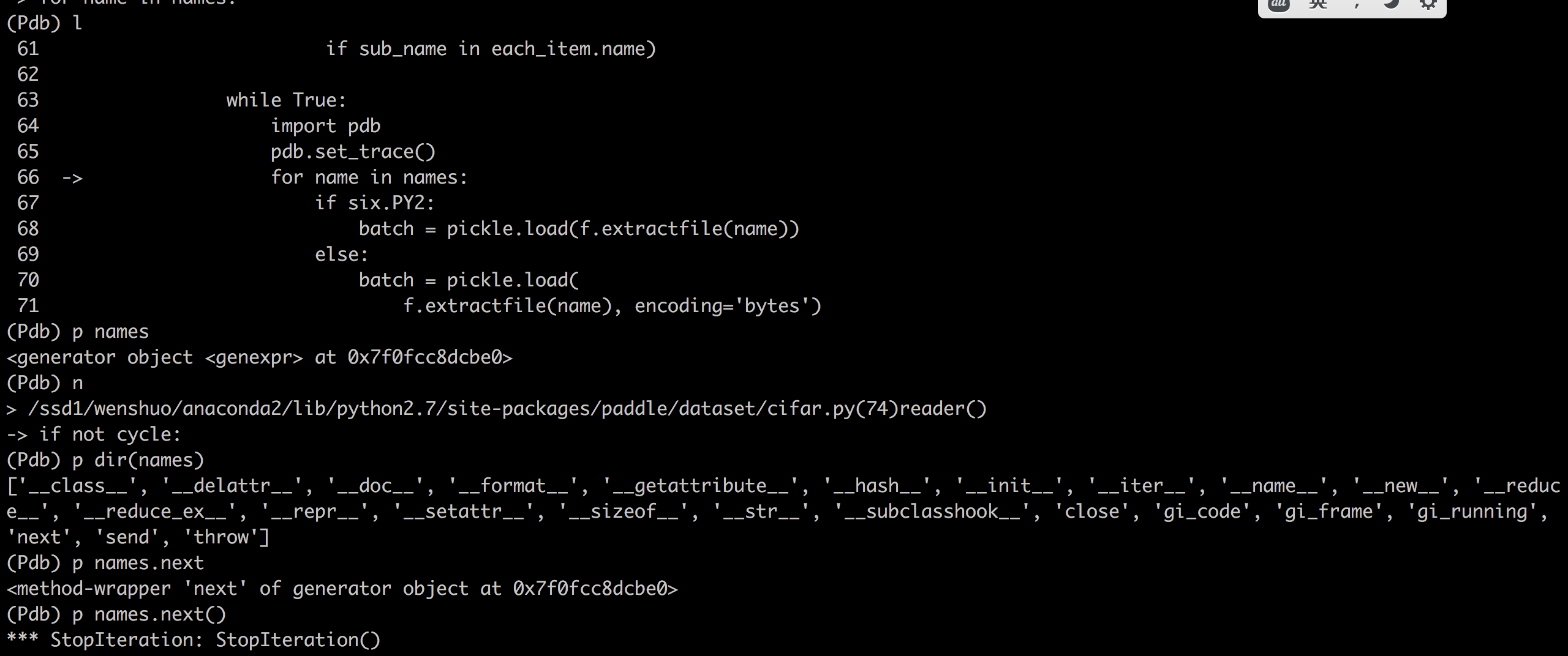 复现信息: 在使用paddle.dataset.cifar.train10()时添加cycle=True参数,程序会卡死,ctrl+c中断发现卡死在reader中 断点调试发现如下