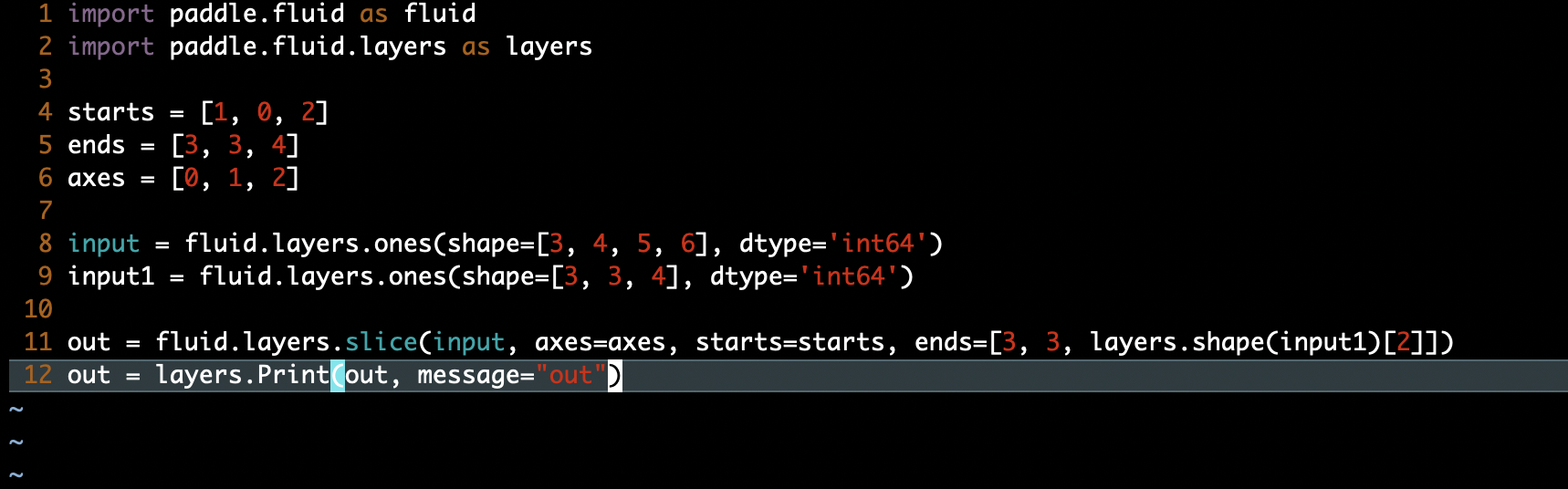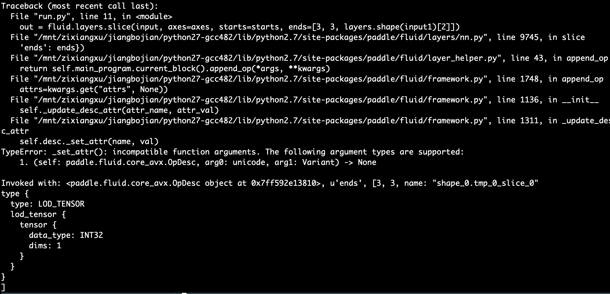 问题描述: 使用layers.slice这个op时,不支持传入动态的参数 程序截图 运行截图