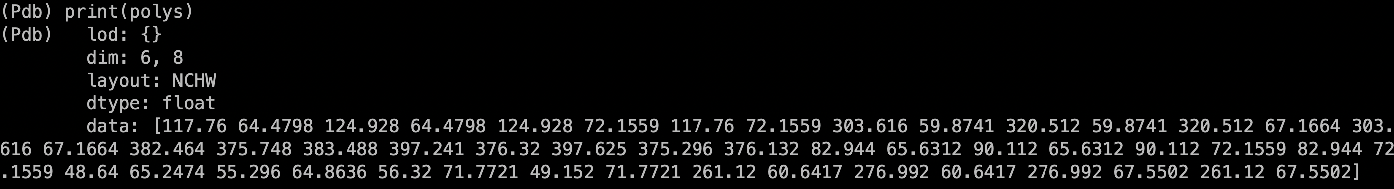 注释掉该op,使用py_func检查输入正常,shape分别为:self.f:[1L, 128L, 128L, 96L], polys:[6L, 8L], 类型为floa32,polys 信息如下:
