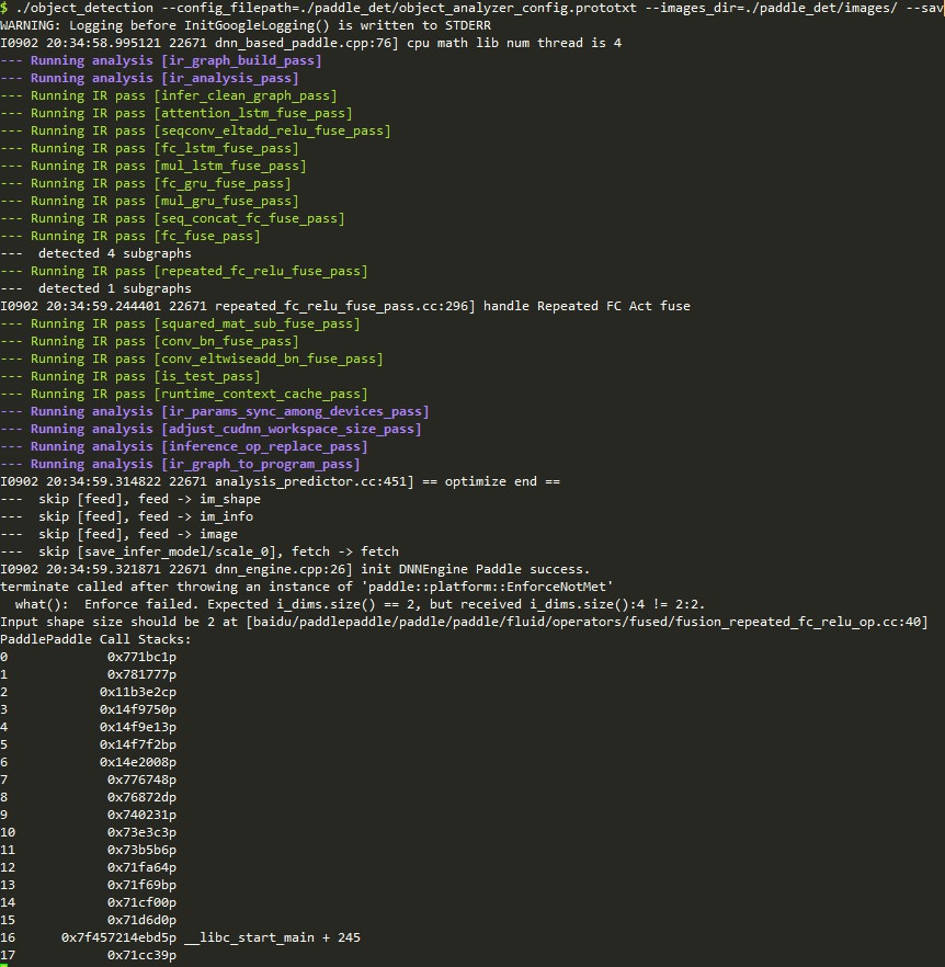 - 复现信息: 1)下载faster_rcnn_fpn模型,并生成__model__,__params__文件; 2)设置Anslysis参数,并生成predictor; 3)图像预处理,归一化并将图像宽高按32补齐; 4)将图像数据,im_info,im_shape输入predictor, 5)运行网络崩溃;
