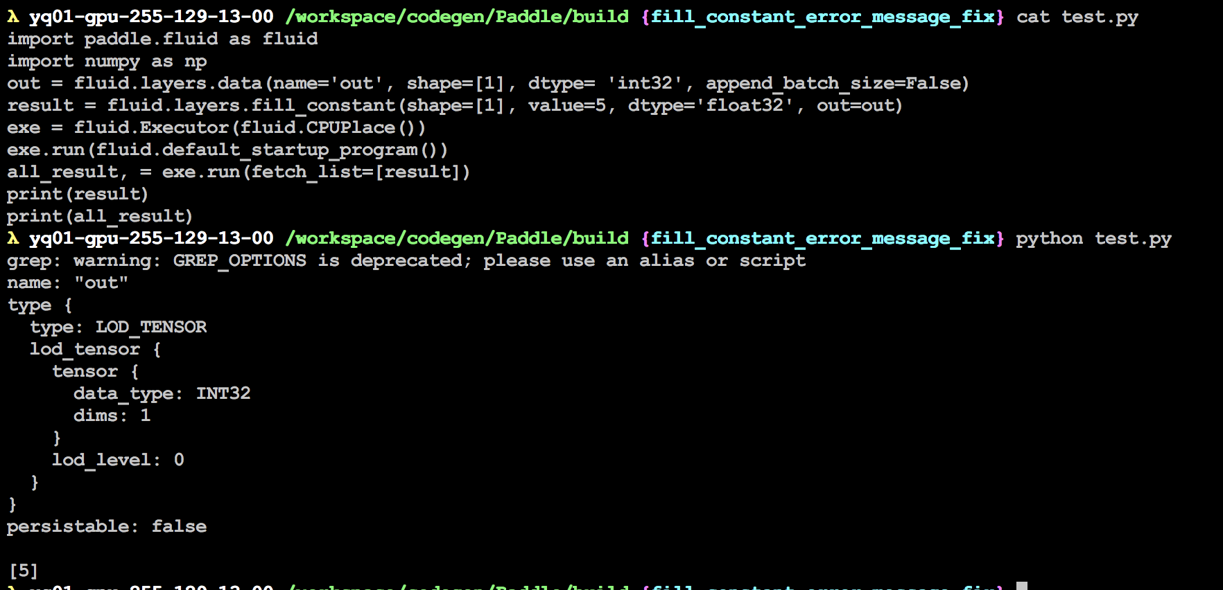 关于这个写法还会有一个很奇怪的现象 我们知道这个函数的API是如下所示 当我们传入的dtype类型和out类型不一致会发生什么现象? paddle.fluid.layers.fill_constant(shape, dtype, value, force_cpu=False, out=None)