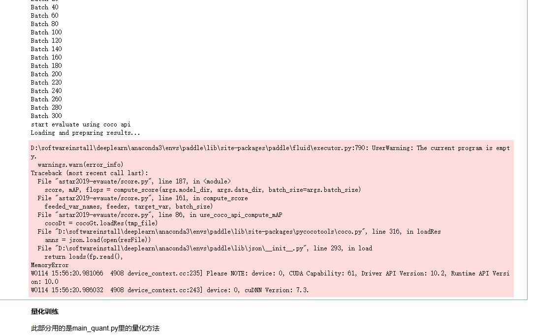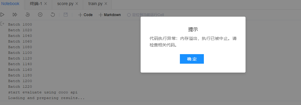 用coco数据集、shufflenetv2-ssd,也就是轻量级竞赛里的内容,epoch_num =8 或10,训练出的模型,使用score.py评分时报内存异常,提交到百度后台大概半小时左右可以出成绩(之前正常模型十几分钟),异常截图如下。同样代码和数据epoch_num=1训练出的模型评分正常。 aistudio(paddle 1.5.0)和本地(1.6.1)都出。