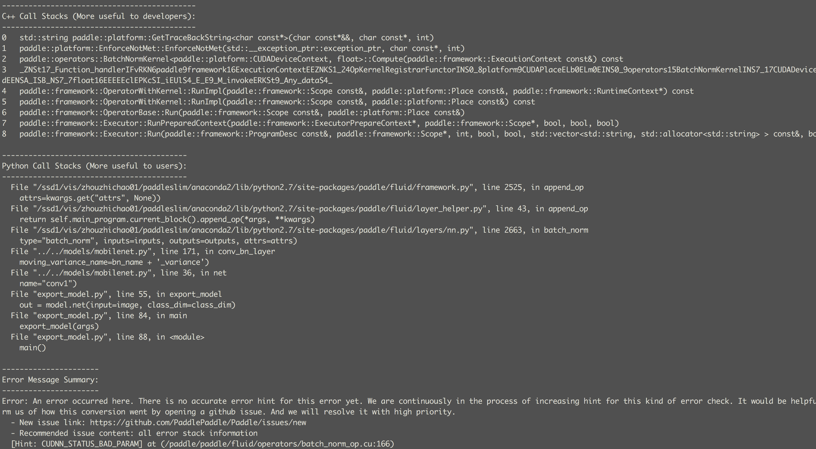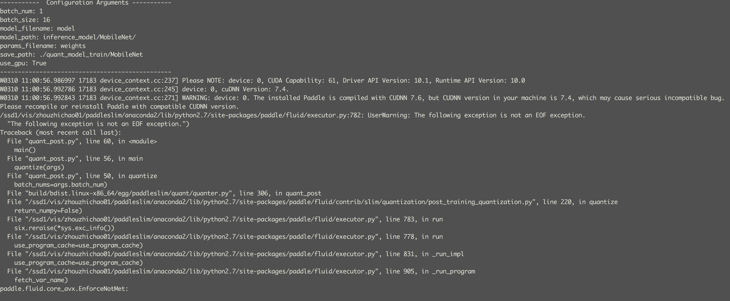 完全按照quant-post的demo教程操作, MobileNet模型从此处下载, 利用export_model.py导出inference model, 然后使用quant_post.py 量化模型。 错误如上图所示。
