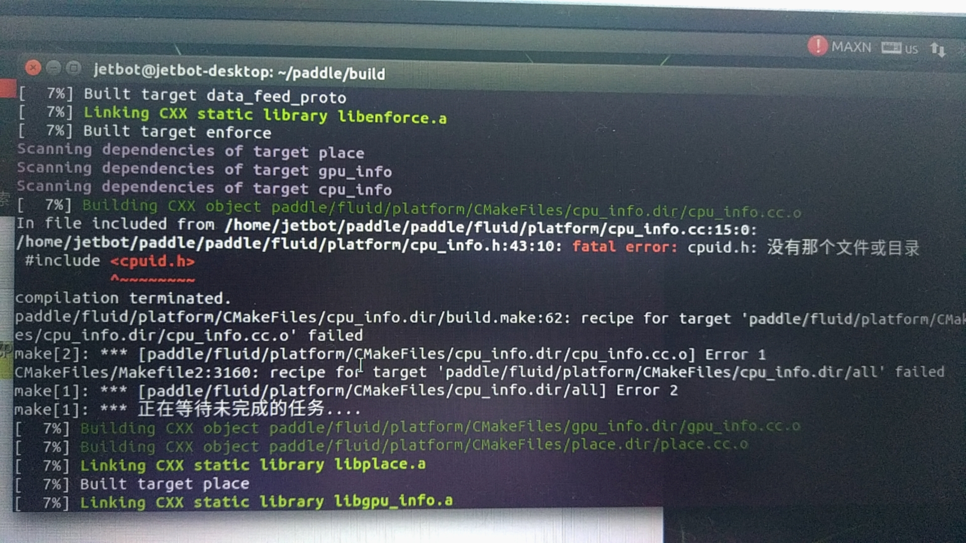 Jetson nano 编译Paddle inference报错缺少cpuid.h头文件