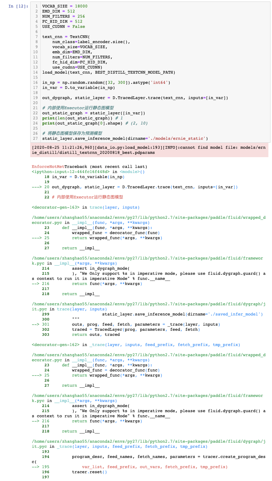 问题: 动态图训练好TextCNN模型后,尝试转静态图失败。
