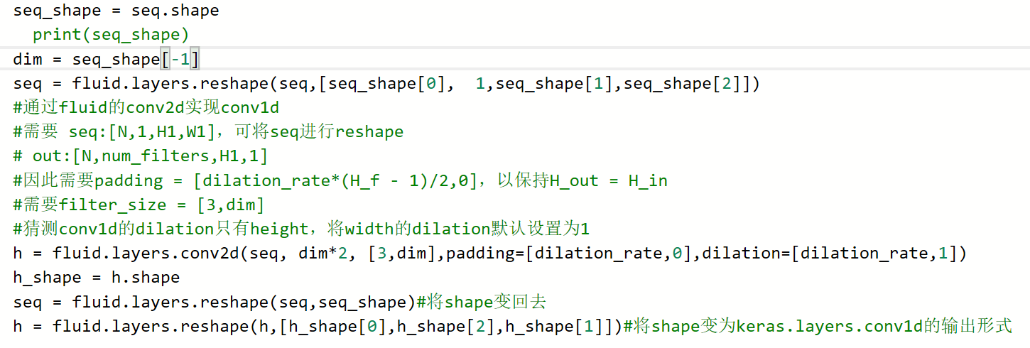 现在paddlepaddle中实现一维膨胀卷积,但是序列卷积API中并没有膨胀系数,所以用二维卷积来实现