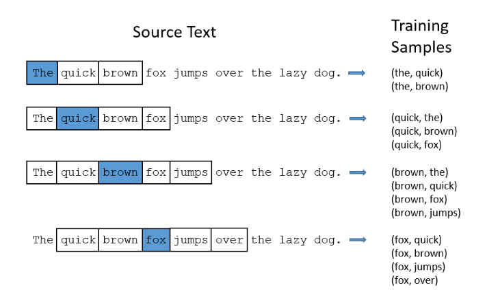 另外我了解的embedding层,主要作用除了降维之外,embedding的输出结果还可以近似表达词之间的相关程度,这就需要训练的时候将输入切分成:context -> target的训练对语料: