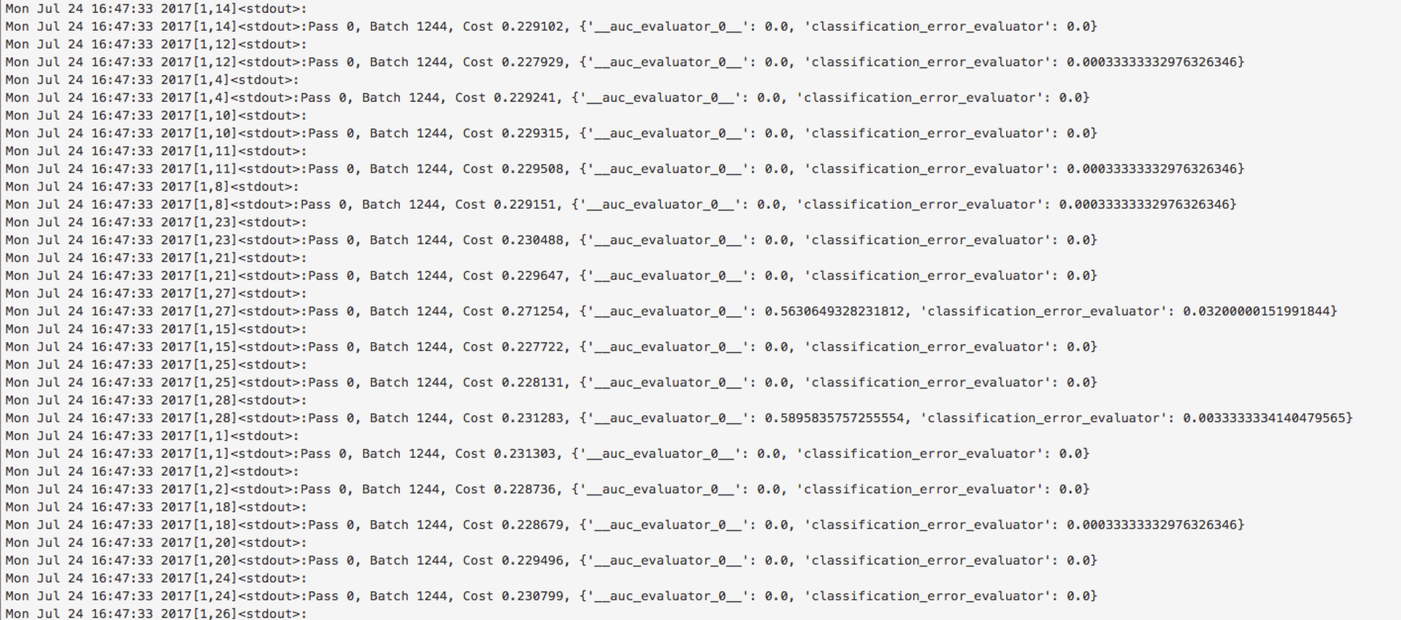 Mon Jul 24 17:03:02 2017[1,7]:Pass 1, Batch 3, Cost 0.248483, {'auc_evaluator_0': 0.0, 'classification_error_evaluator': 0.0}