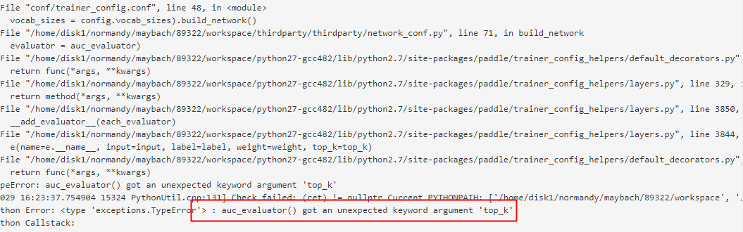 背景: 用v1版本的paddle进行集群训练,设置classification_cost(evaluator=auc_evaluator)出错,如下