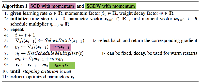 A very interesting thing is, decoupling weight decay and the optimization steps are proposed by a recent paper: Fixing Weight Decay Regularization in Adam, and is claimed to have a better learning performance on CIFAR-10 and ImageNet32x32. The green color one is the way PaddlePaddle uses and the variant proposed by the paper.