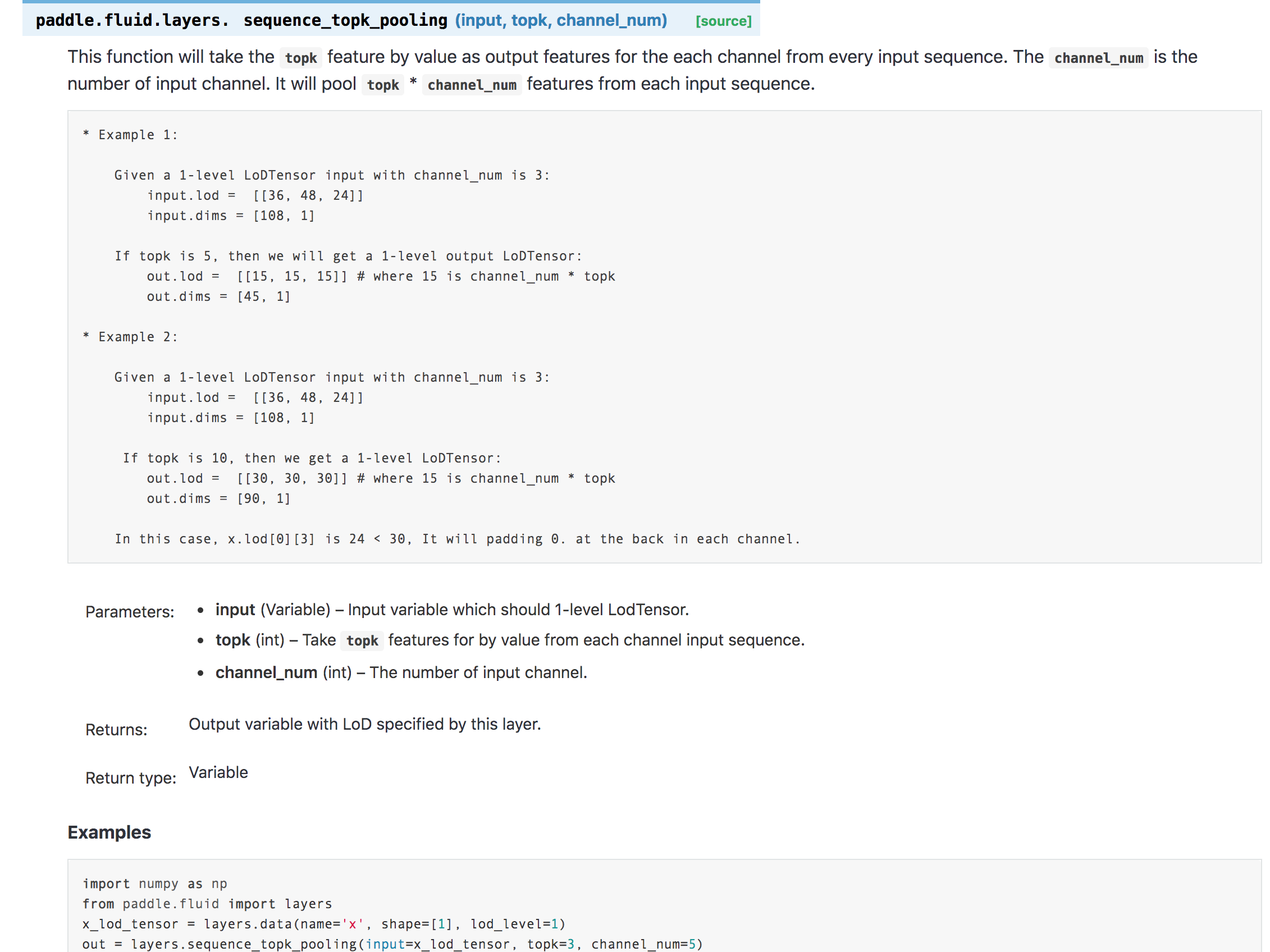 import numpy as np from paddle.fluid import layers x_lod_tensor = layers.data(name='x', shape=[1], lod_level=1) out = layers.sequence_topk_pooling(input=x_lod_tensor, topk=3, channel_num=5)