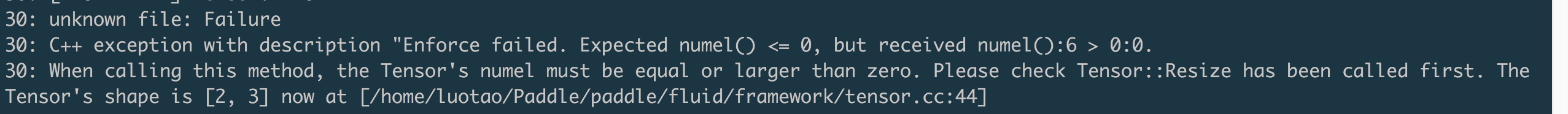 30: When calling this method, the Tensor's numel must be equal or larger than zero. Please check Tensor::Resize has been called first. The Tensor's shape is [2, 3, 4, 9] now at [/home/luotao/Paddle/paddle/fluid/framework/tensor.cc:44]