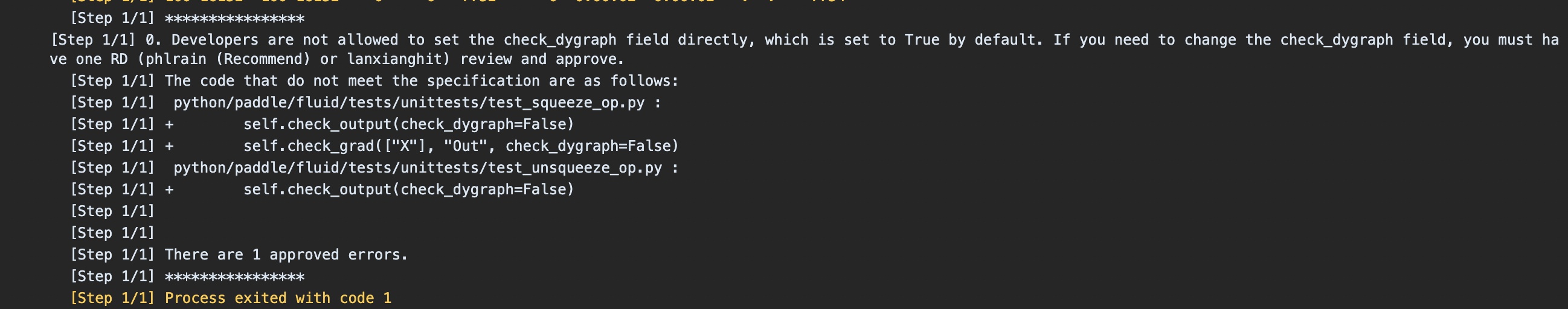CI检查失败提示: 0. Developers are not allowed to set the check_dygraph field directly, which is set to True by default. If you need to change the check_dygraph field, you must have one RD (phlrain (Recommend) or lanxianghit) review and approve. The code that do not meet the specification are as follows: