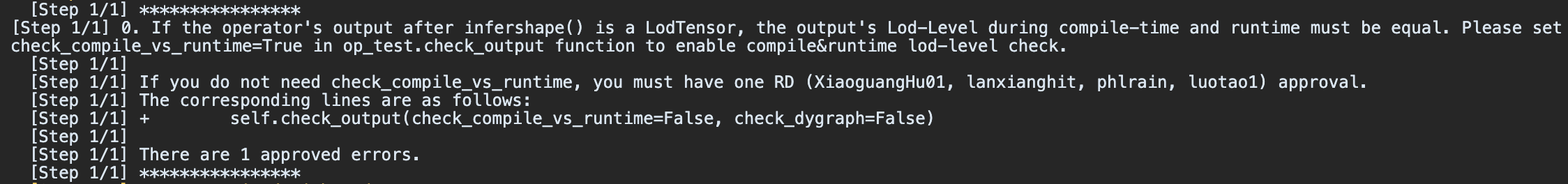(1)runtime&compile time各执行一次infershape(),输出如果是lod_tensor,其lod_level需要对齐(参考:#20961)。 本PR中将runtime&compiletime lod_level_check 设置为默认打开。 (2)将所有OP设置打开lod_level_check,统计不能通过的OP白名单。输出检查中跳过这些白名单。 (3)设置增量检查,当新增OP设置不执行runtime&compiletime lod_level对齐检查时,需要申请同意。效果如下: 增量检测: PR#21511