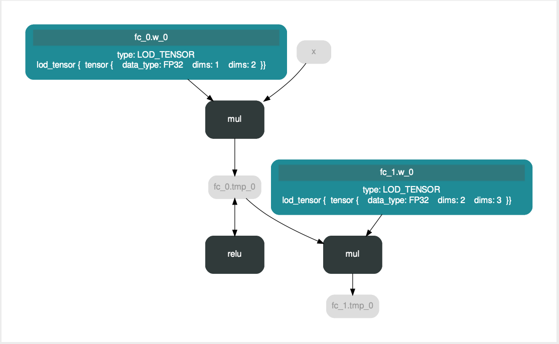 较旧的 Fluid 版本中 activation helper 会添加 inplace 算子,裁剪时可能会错误地将模型最后的 activation 舍弃(https://github.com/PaddlePaddle/Paddle/pull/9740 https://github.com/PaddlePaddle/Paddle/issues/12609 );如上图最后一层 mul 之后原应存在的 relu 层。为规避此问题,保存预测模型时添加了一个 scale 层(https://github.com/PaddlePaddle/Paddle/pull/15365 ),但这改变了原有的模型结构。
