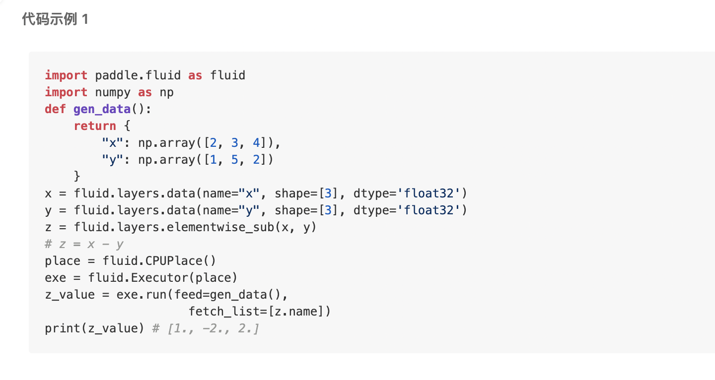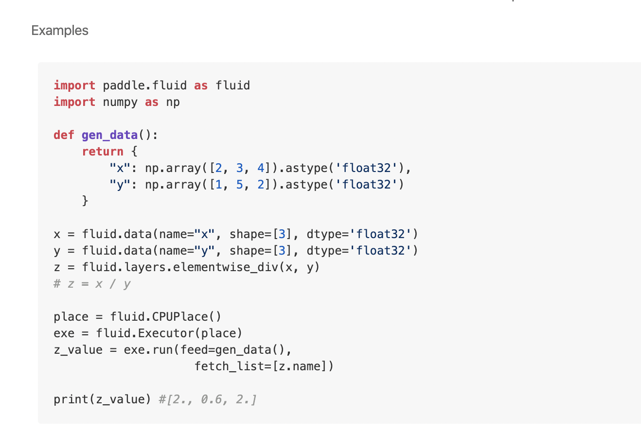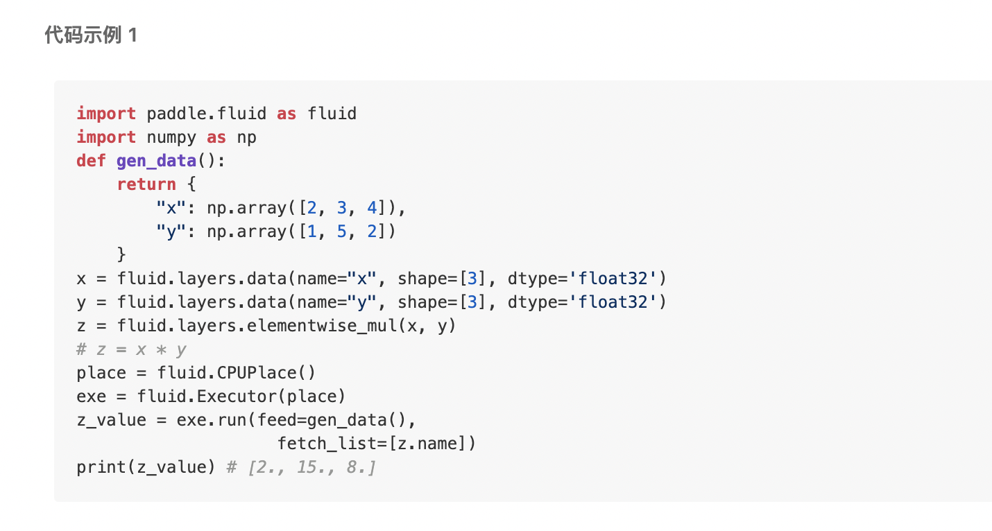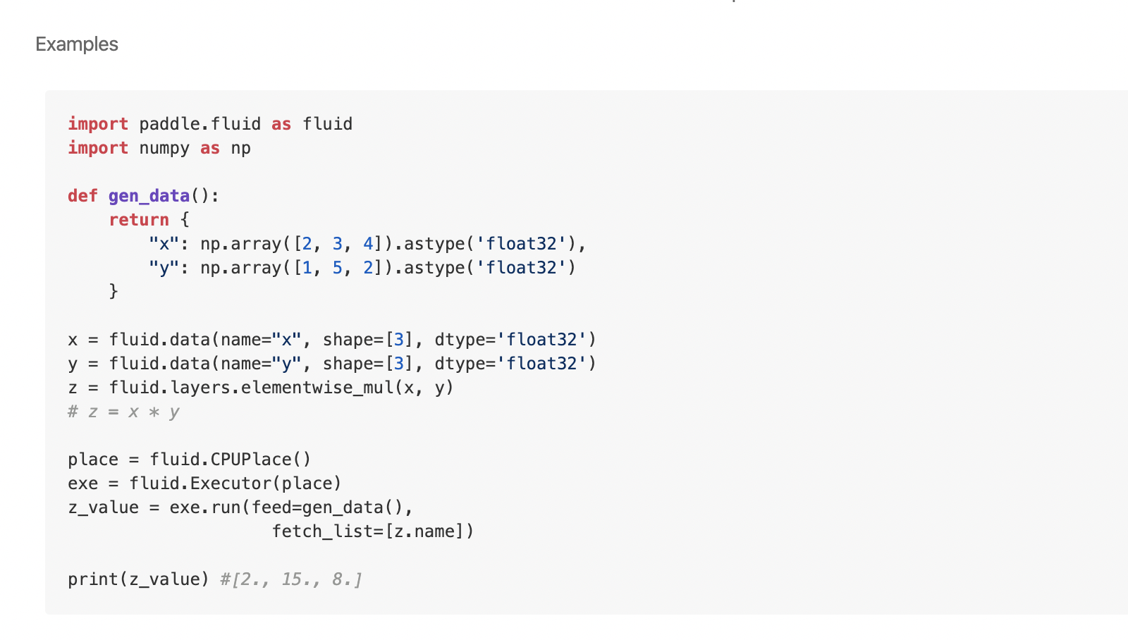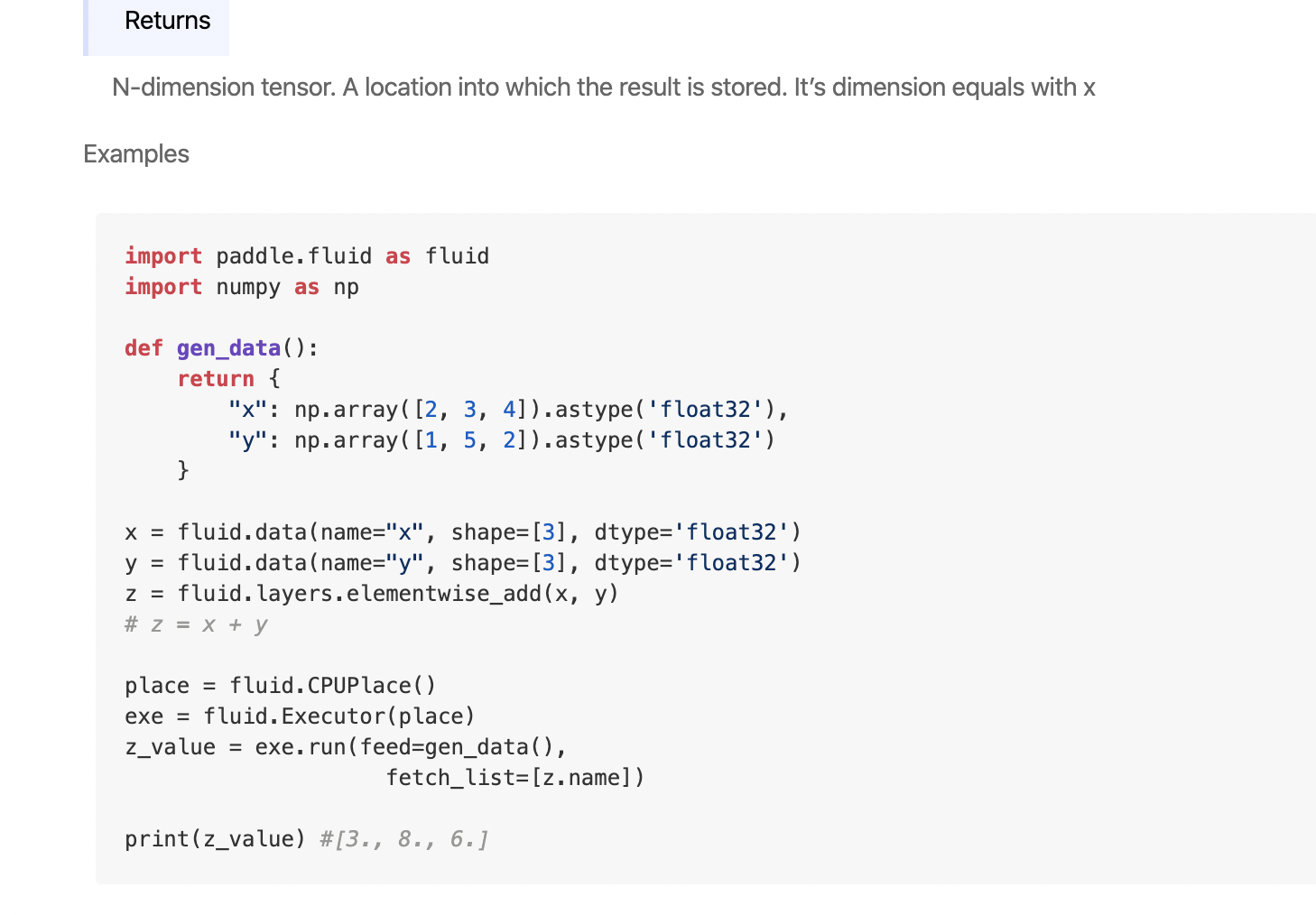 新增elementwise_add、elementwise_sub、elementwise_mul、elementwise_div文档使用示例,文档加入使用 + - * /示例 1 2 3 4 5 6 7 8