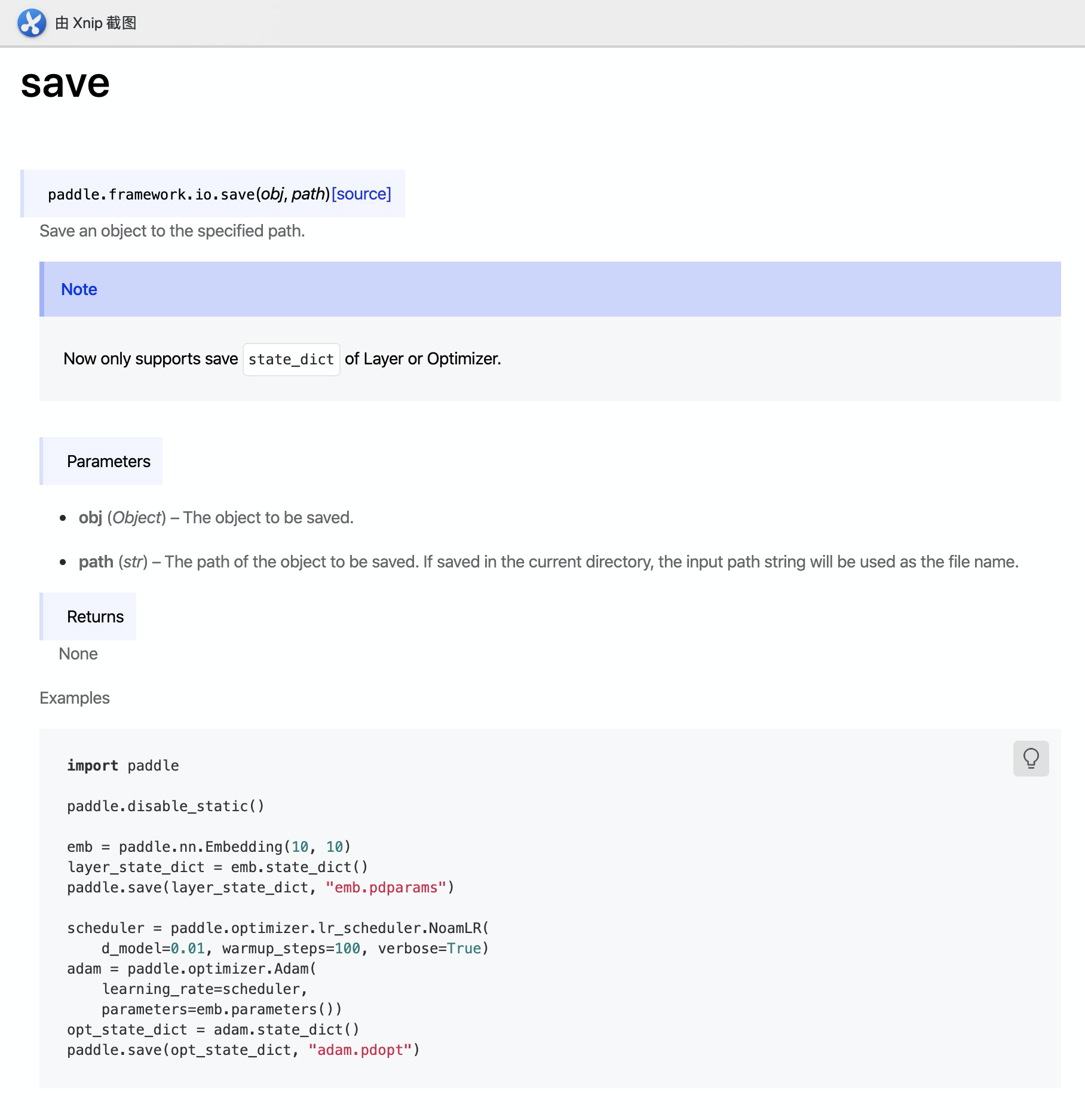 行为:不再添加后缀,用户根据自己需求添加emb = paddle.nn.Embedding([10, 10]) layer_state_dict = emb.state_dict() paddle.save(layer_state_dict, "emb.pdparams") # 存储结果:emb.params adam = paddle.optimizer.Adam( learning_rate=0.001, parameters=emb.parameters()) opt_state_dict = adam.state_dict() paddle.save(opt_state_dict, "adam.pdopt") # 存储结果:adam.opt