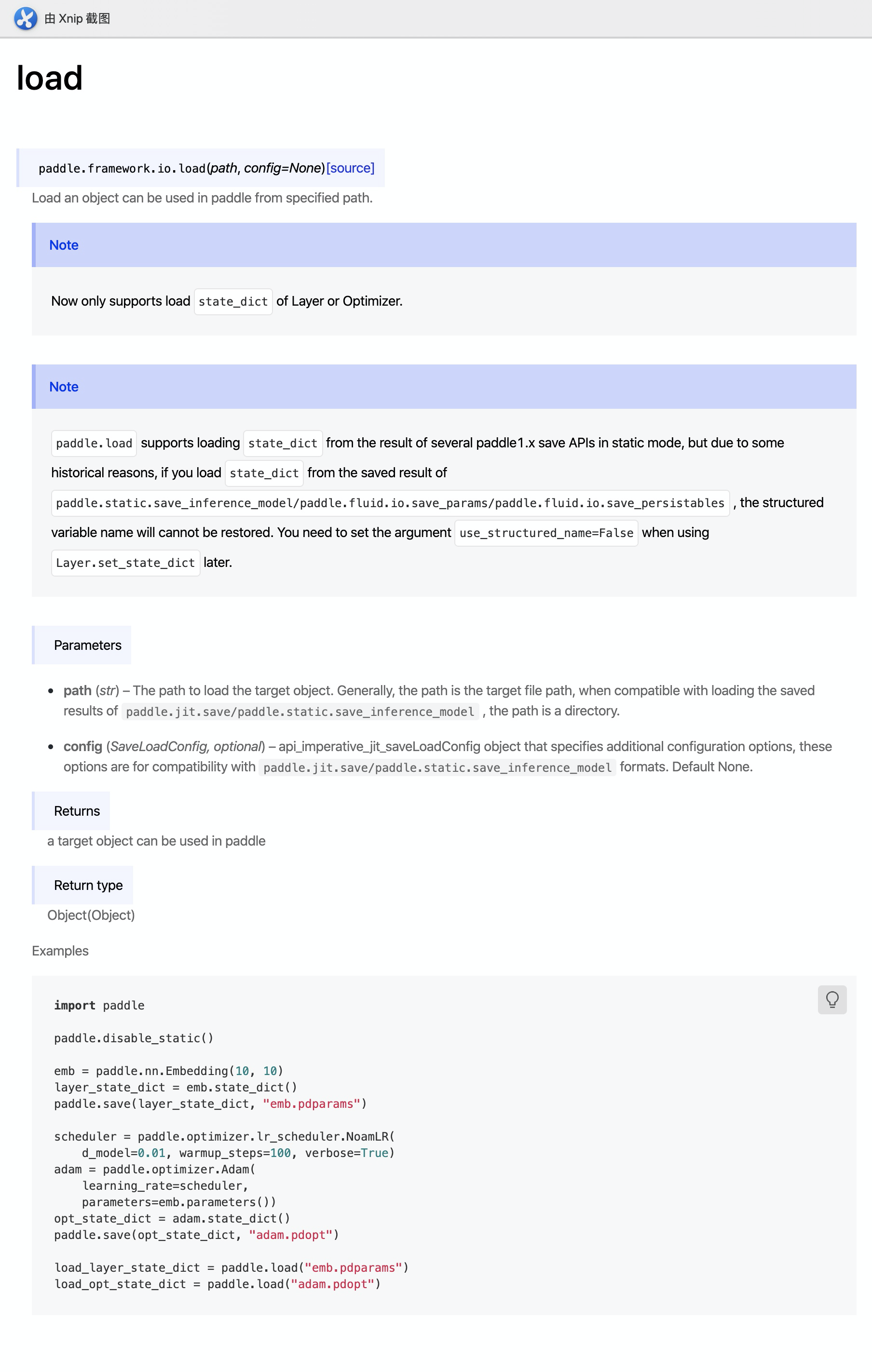 仅支持存储模型或优化器的state_dict,目前的paddle.load
