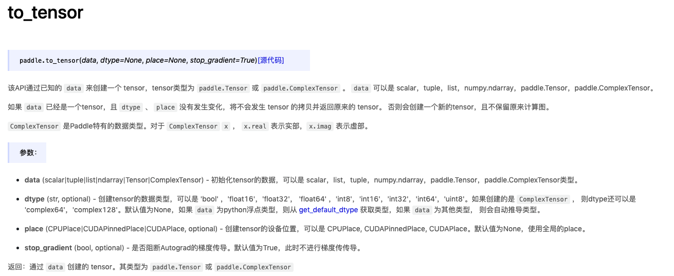 https://www.paddlepaddle.org.cn/documentation/docs/zh/develop/api/paddle/tensor/creation/to_tensor_cn.html#to-tensor