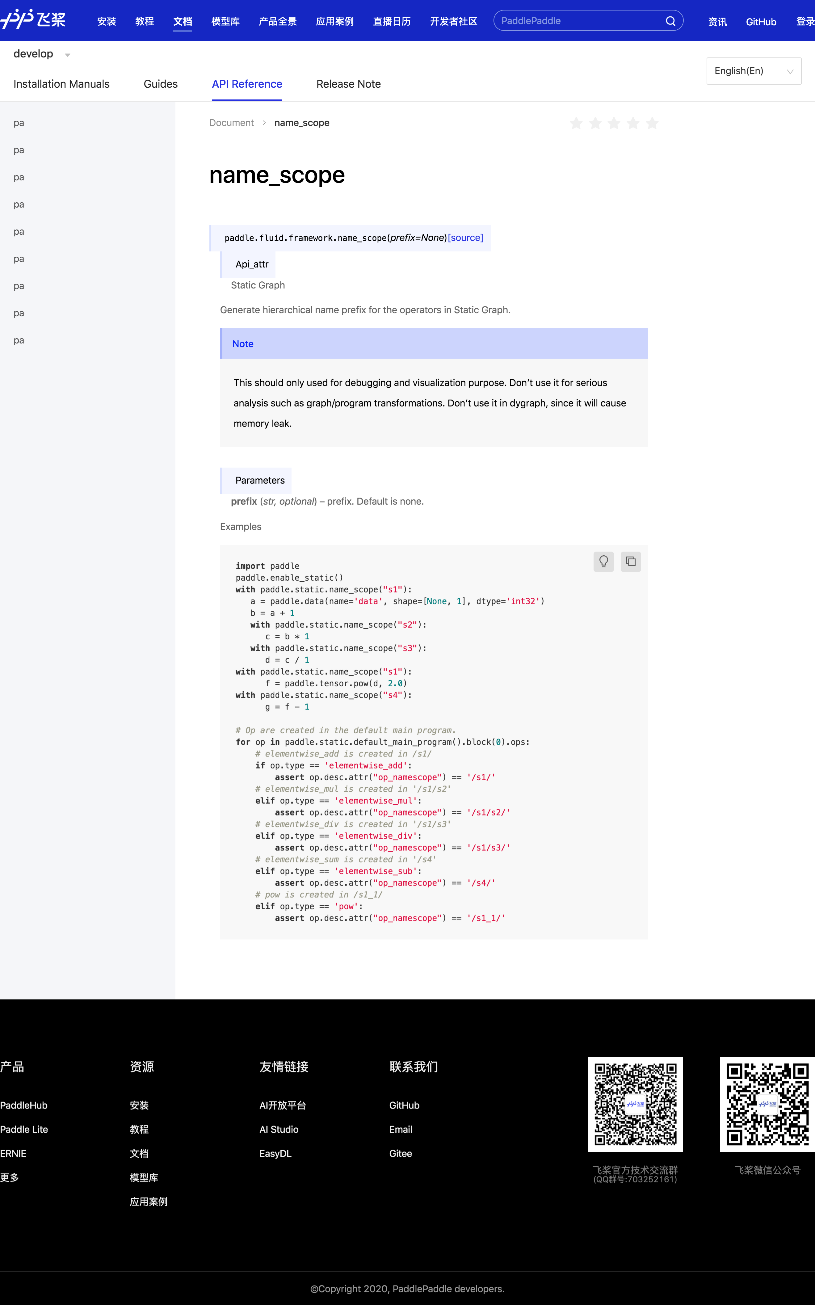 (1)1.8API list:paddle.fluid.name_scope (2)2.0_main_alias:paddle.static.name_scope (3) 组长建议:新API名称:暂无,文档和示例待更新