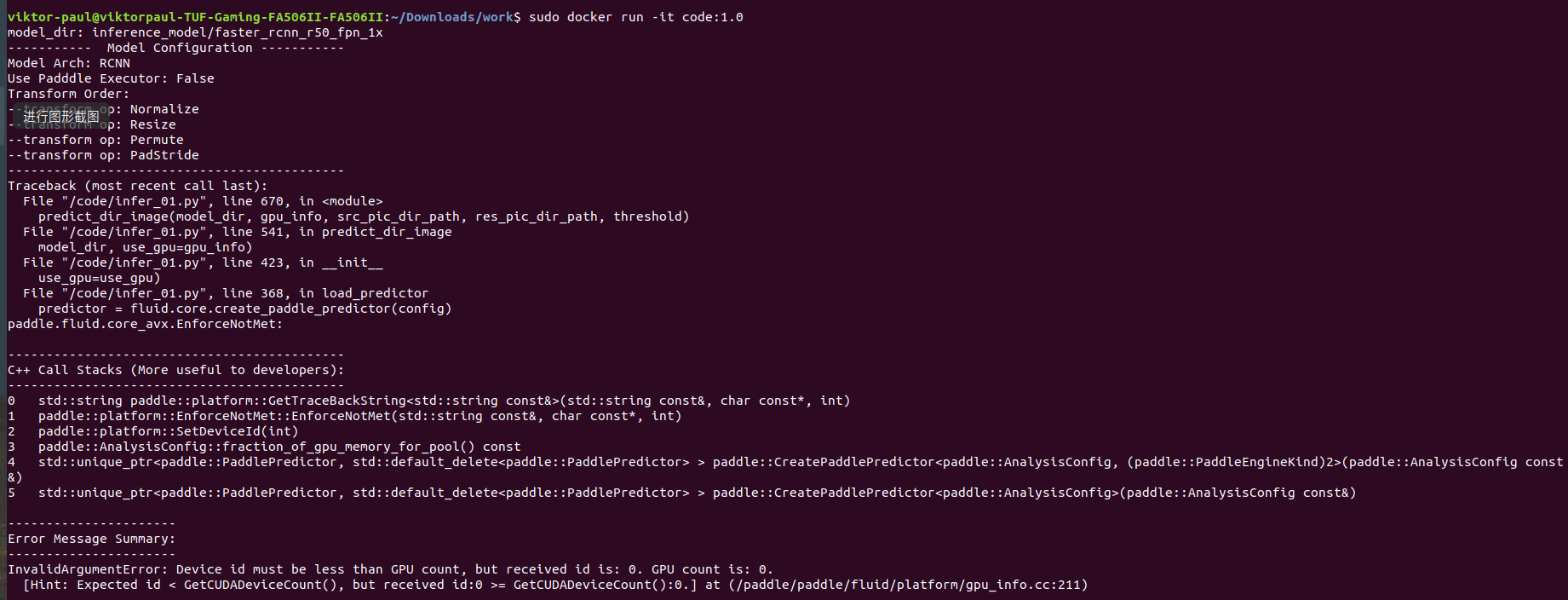 您好,最近刚接触docker,想使用docker实现项目的快速交付,在官网也没有找到相关的资料,学习了一段时间,把python端的推理部署打成了docker镜像(python端的推理部署正常),运行该镜像后出现了下面的错误: